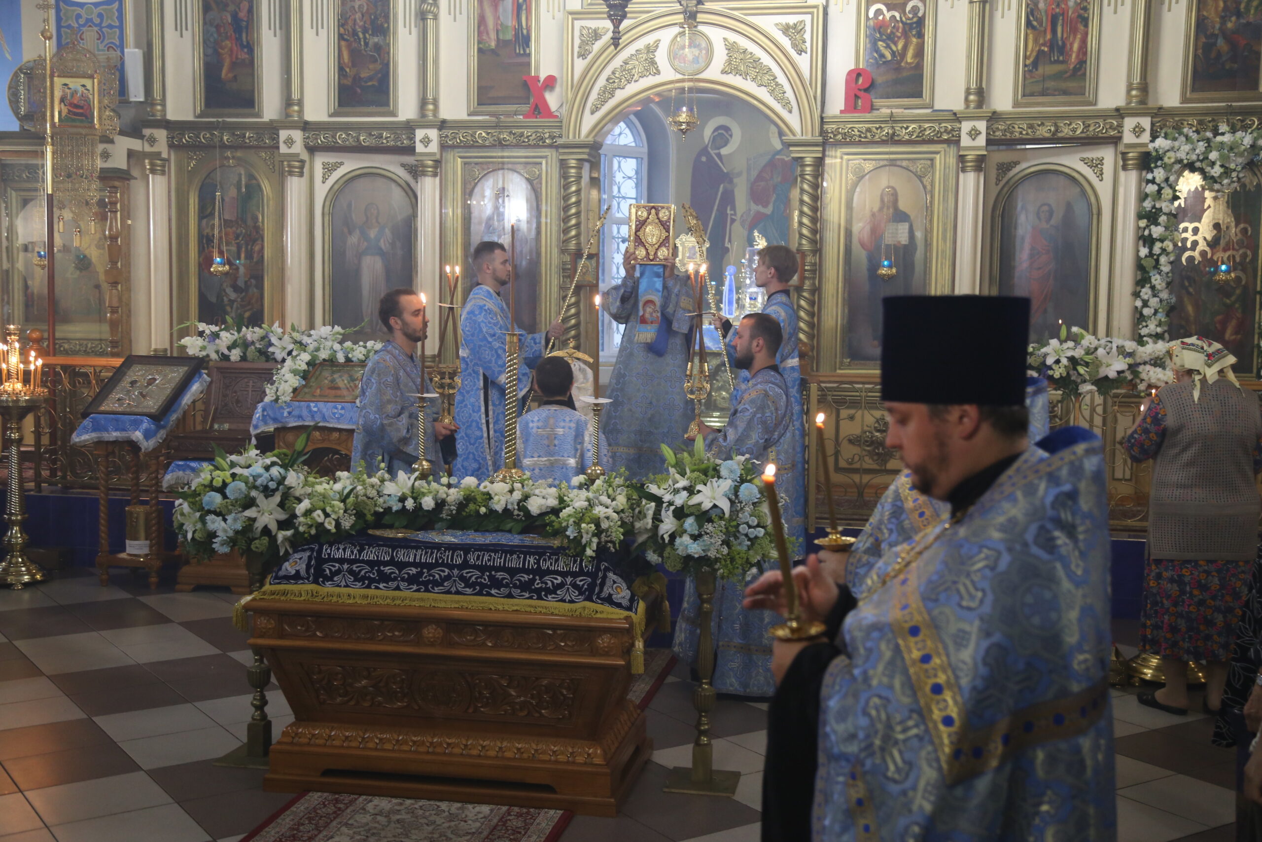 На полиелее из алтаря была вынесена плащаница с изображением Успения Божией Матери.