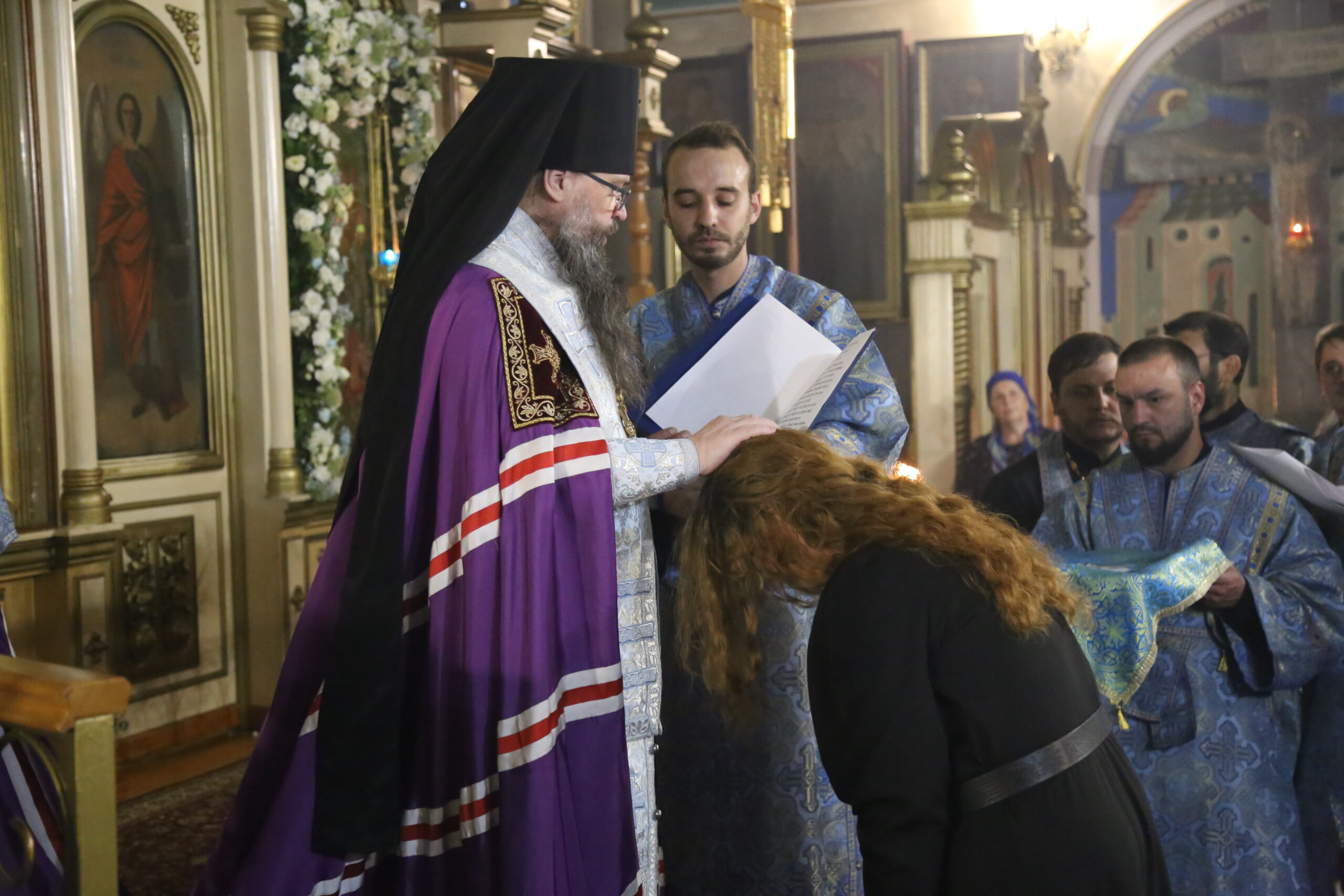Затем в центре собора была вознесена молитва ко Пресвятой Богородице и провозглашены уставные многолетия.