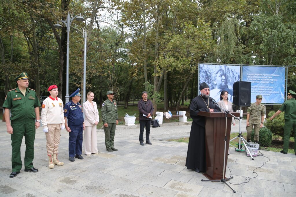 В праздник перенесения мощей святого князя Александра Невского председатель епархиального Отдела по взаимодействию с Вооруженными силами и правоохранительными органами иерей Григорий Фомин принял участие в акции «Земля героев» в Комсомольском парке г. Махачкалы.