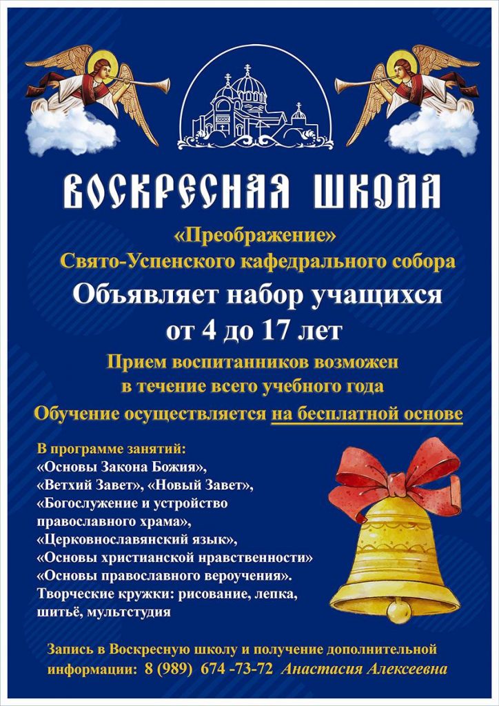 Воскресная школа «Преображение» Свято-Успенского кафедрального собора города Махачкалы объявляет набор учащихся в возрасте от 4 до 17 лет на новый 2023/2024 учебный год. Занятия будут проходить по субботним и воскресным дням в пяти возрастных группах: группа №1 (от 4 до 5 лет); (Сб.) группа №2 (от 6 до 7 лет); (Сб.) группа №3 (от 8 […]